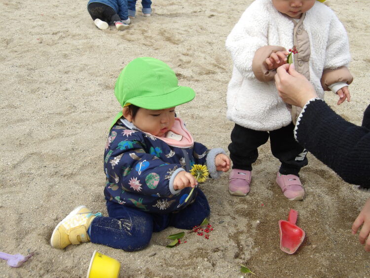 保育士が渡すとみんな興味津々で、タンポポをくるくると回してよく観察をしていました![]()