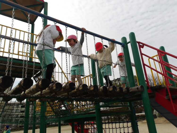 遊具のゆらゆら橋では、「だれだー!オレさまの橋をわたるのはー!」とがらがらどんごっこが始まり、盛り上がっていました😊