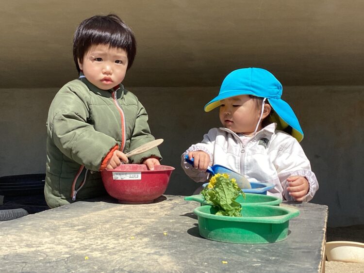 園庭チームさんは昨日いただいてきた菜の花を使って遊びました!
