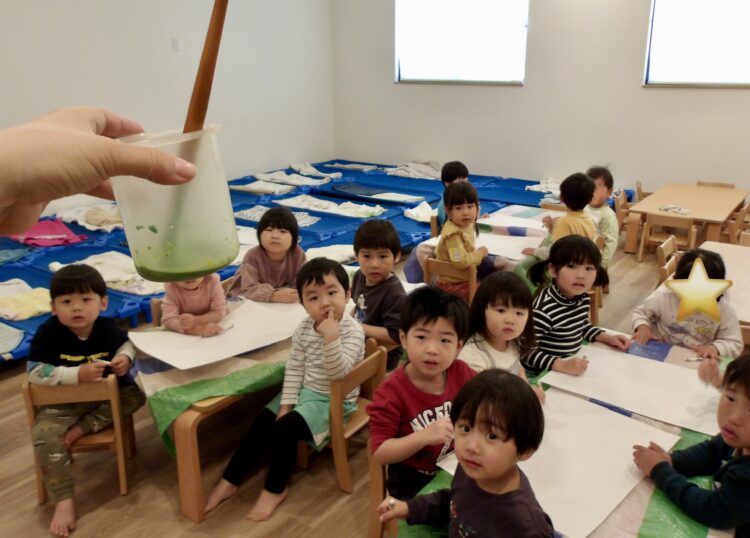 何色になるか予想しながらも、「みどりじゃーん!」とできた色に興味津々の子どもたち。