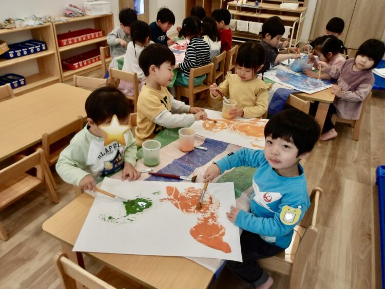 それはさておき、絵の具を混ぜて、何色になるかの実験をしました。「つぎは、あかとあお!」「つぎは、きいろとあお!」と次々にリクエストが飛び交います。