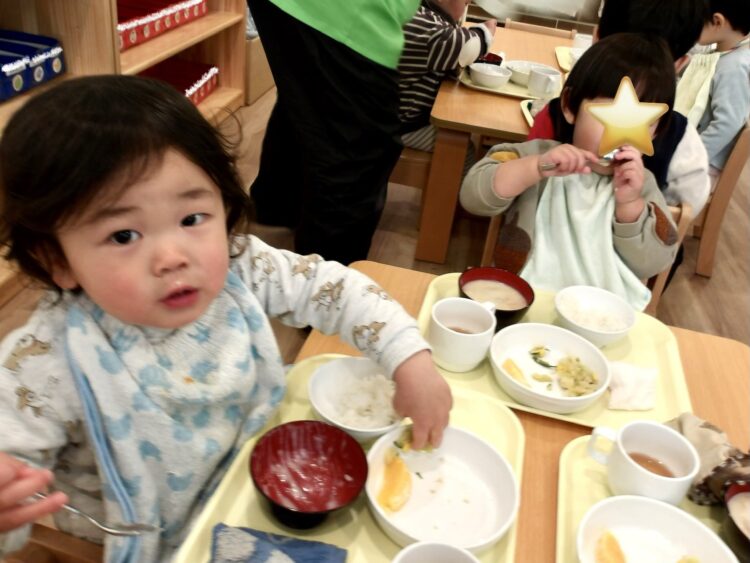 いい匂いがしてくると、待ちに待った給食の時間です♪今日の給食はクリームシチューでした!大好きなオレンジもついていて、あっという間にペロリと食べてしまう子どもたち🍊