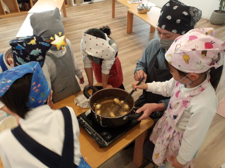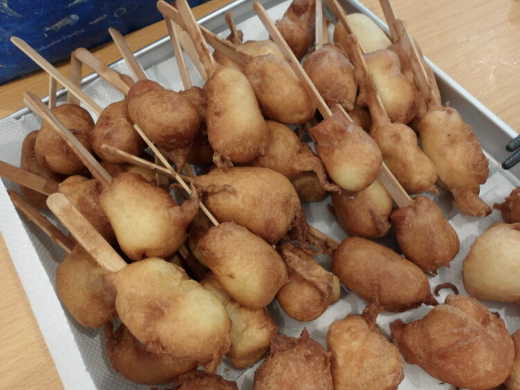 自分たちで切った魚肉ソーセージにホットケーキ生地のお洋服を纏わせて、ゆっくり油の中へ・・・