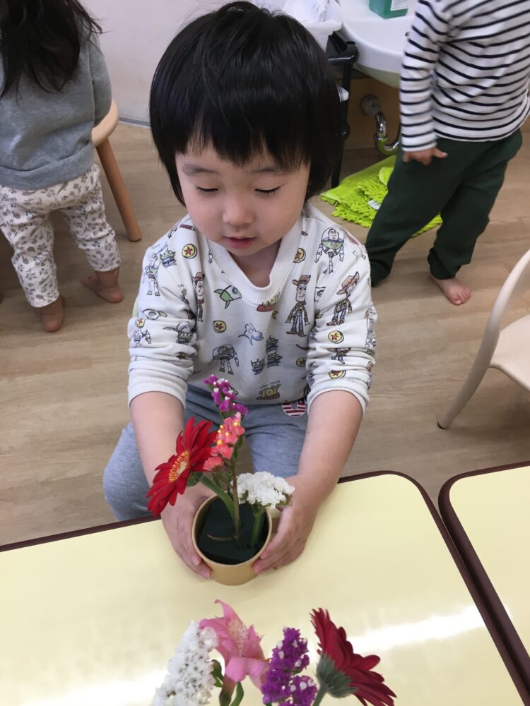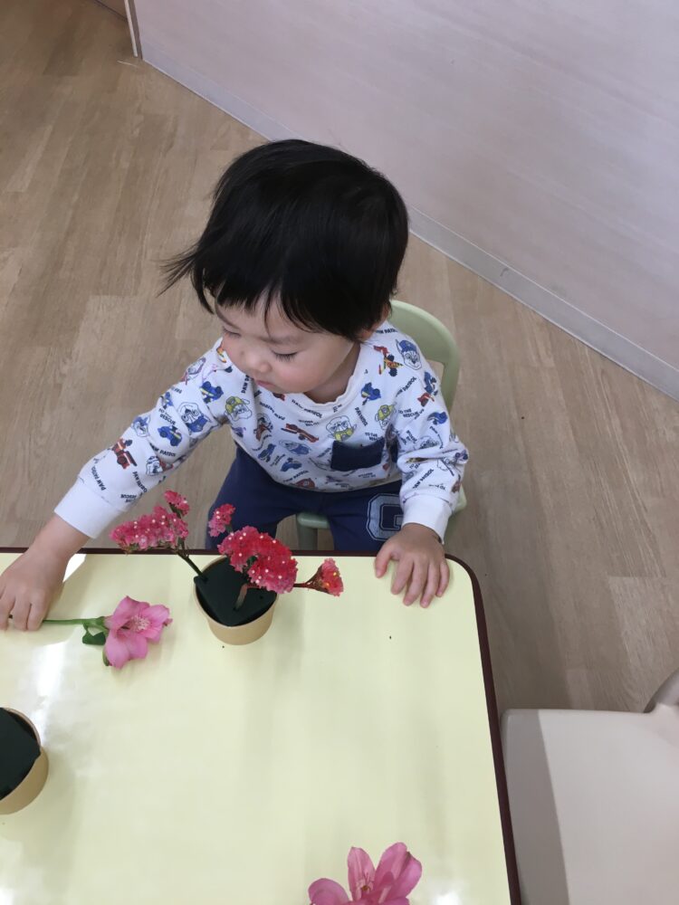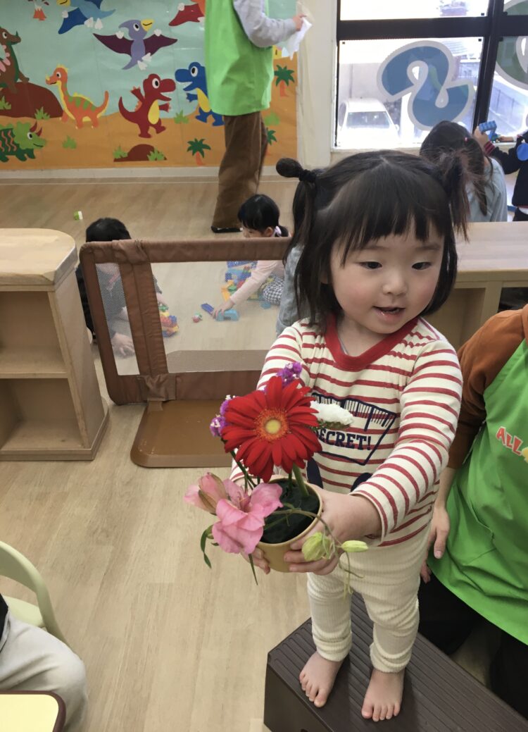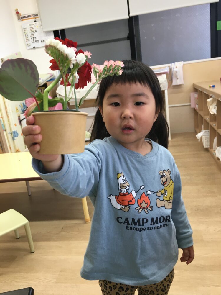 ガーベラを見て、「おっきい!」と言ったり、ポポラスを見て「うちわみたい」と言ったりと、お花ひとつひとつに興味津々でした🌸