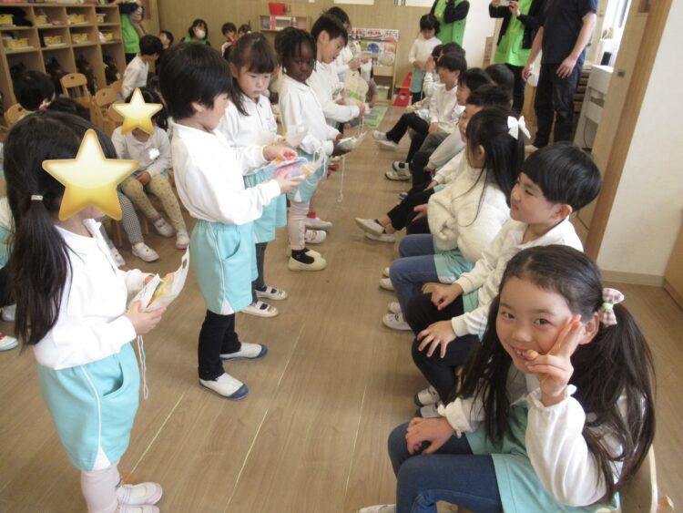 ぞう組さんへのインタビューを聞いたあと、在園児の子どもたちからプレゼントを手渡ししました!