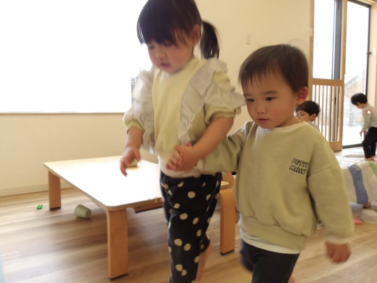 仲良く手をつなぎ、お部屋をお散歩する姿も!