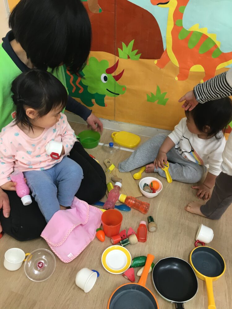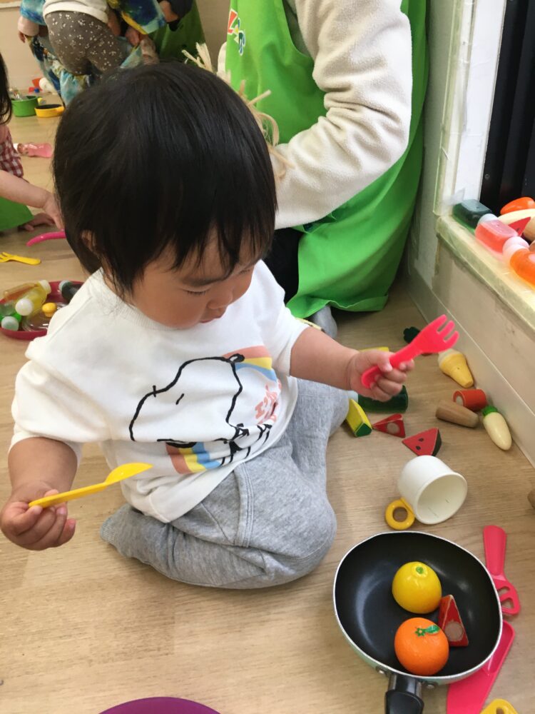今日は室内でゆったりと、おままごと遊びを楽しみました。料理を作ってお友だちや保育士に振る舞ったり、お人形を背負って赤ちゃんをあやしたりと、それぞれが思い思いの遊びを広げていました。