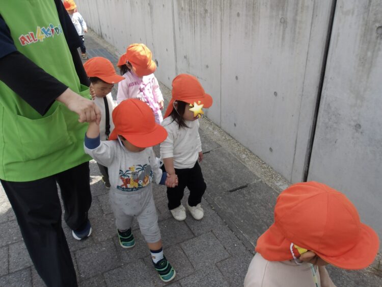 転ばないように慎重になったり、転びそうになると保育者に手を伸ばし一緒に歩いて楽しんでいました。