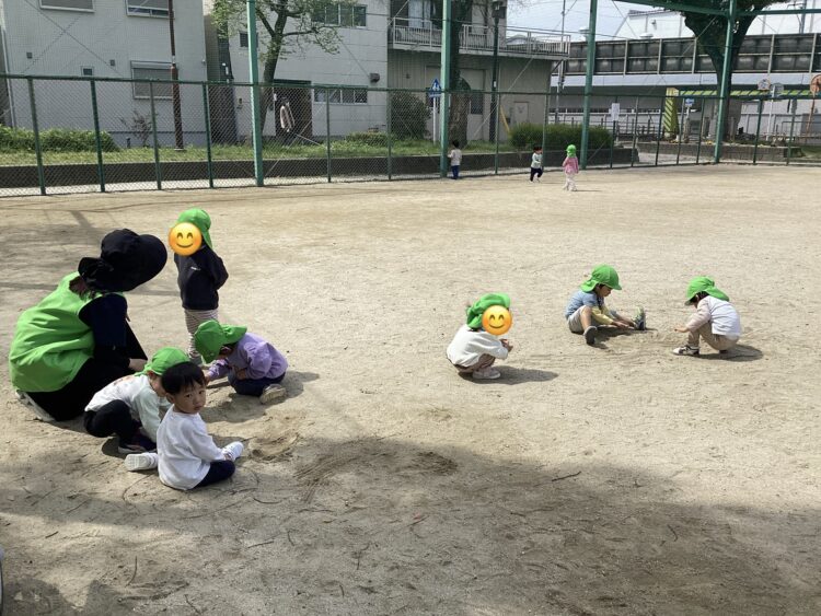 「カレーパンマン!」と地面に絵を描いて見せてくれたり、手をブルドーザーにして砂を集めてお山を作ったり、今日もそれぞれの発想で面白い遊びがたくさん広がっていました😊💡