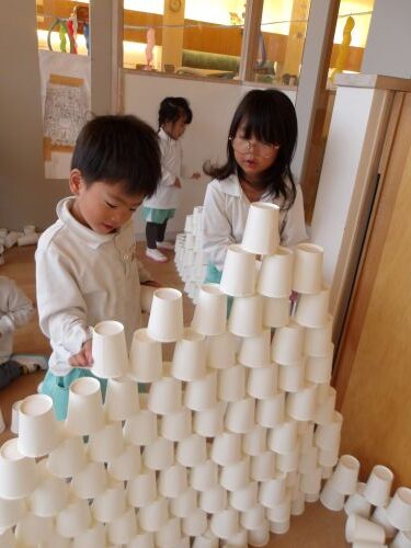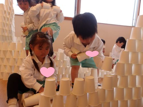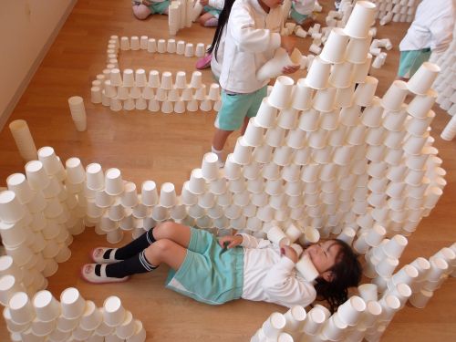 紙コップでお城を作って紙コップでつくった建物の中で寝てみているお友だちがいましたよ😆
