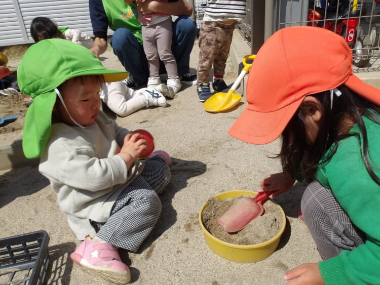 お砂場でお友達とスコップで掘ってみたり、、、