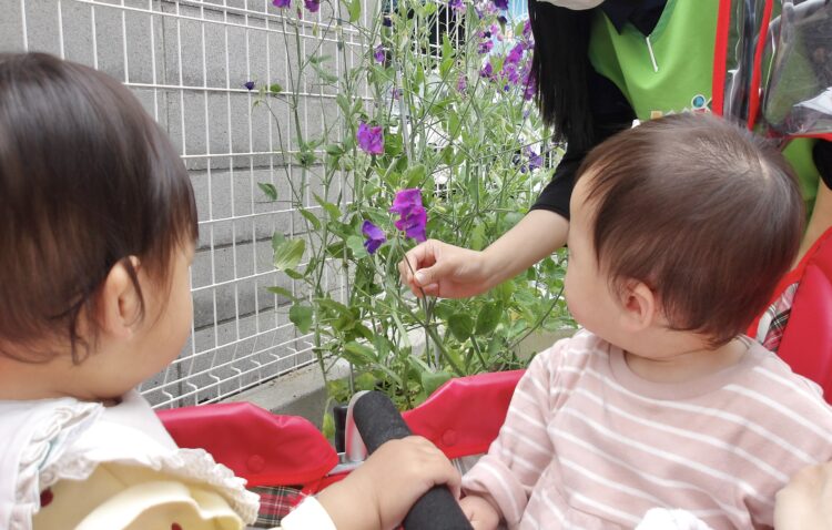 園庭で育てているえんどう豆のお花を観察しました!