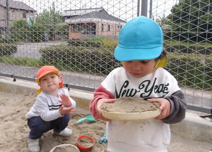 あひる組さんとりす組さんはお砂場で幼児さんと一緒に砂遊びをして遊びました😆