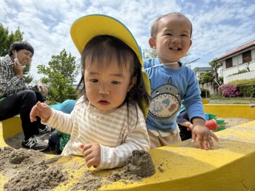 公園に到着するとさっそく砂場に興味津々のあひる組さんです👀好きなおもちゃを選んでお砂場遊びのスタートです✨