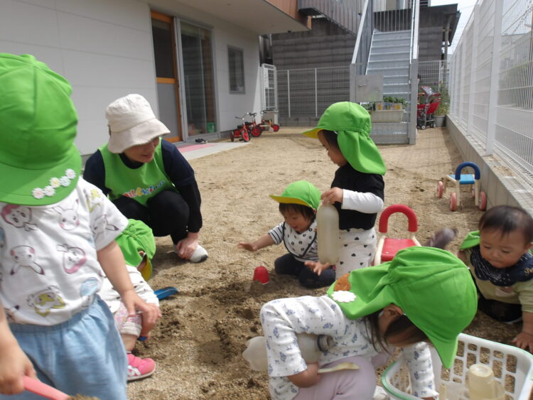 「じゃー」とカップに砂を入れたり、お山作りを保育士と一緒にしたりしました![]()