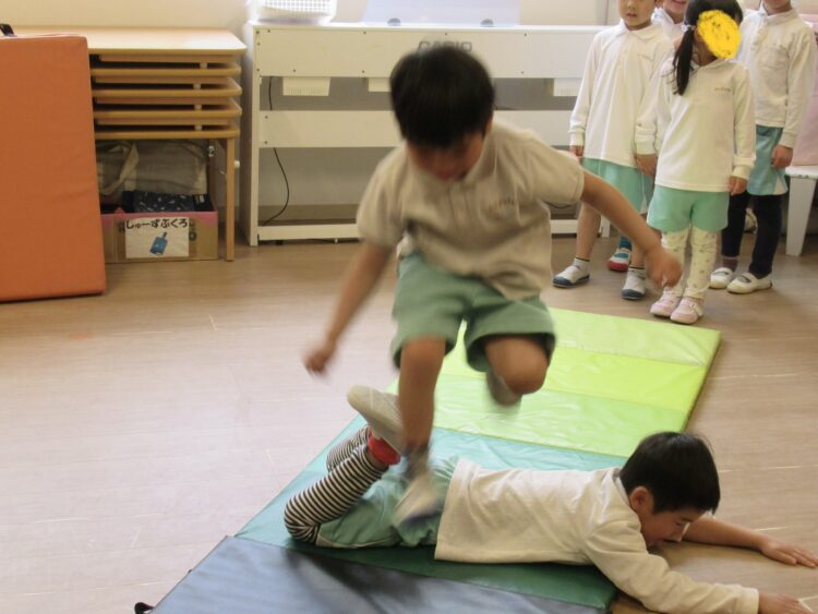 お友達とペアになって一人が寝転びもう一人がジャンプして進んでいきます✨