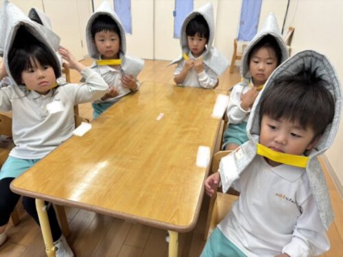 避難訓練の後に地震の絵本を読んだり、防災頭巾の被り方を確認したりしました