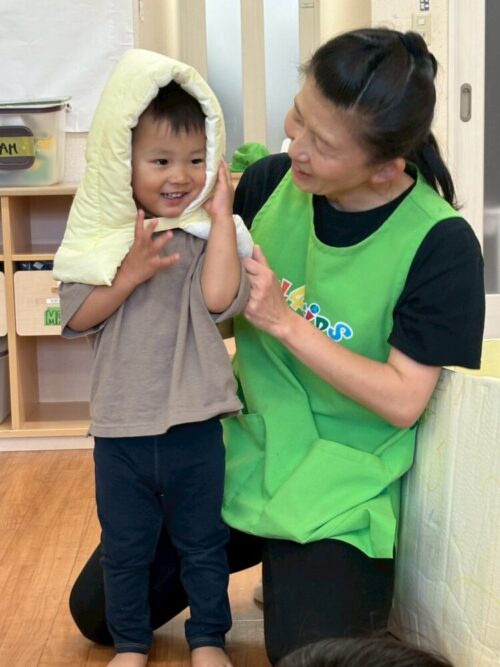 頭につけた防災頭巾で、なんだか不思議な感じの子ども達は