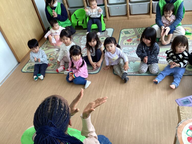 大好きなEnglish timeでは、先生の動きに合わせて一緒に手拍子をしたり体のパーツを触ったりして楽しそうでした💕