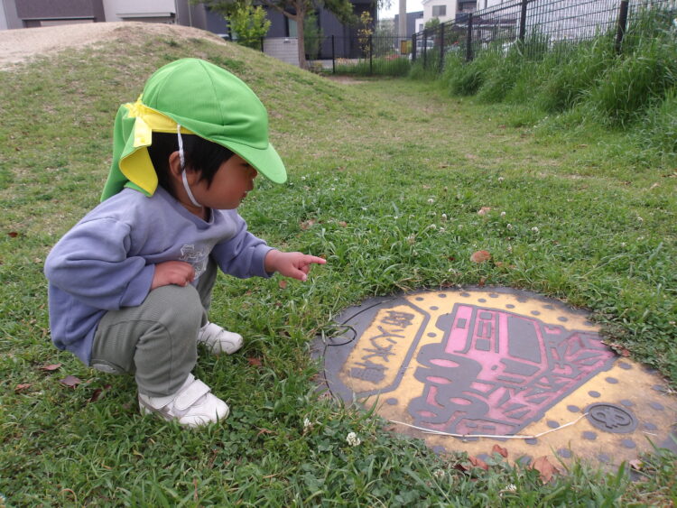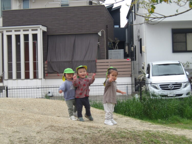 普段は散歩車に乗って公園へ行きますが、今日は歩くのが好きな子数名は保育者と手を繋いで歩いて向かいました☺️