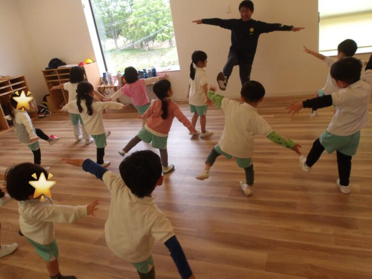 屈伸したり、手を組んで伸びをしたり、見よう見まねで取り組もうとしていました。