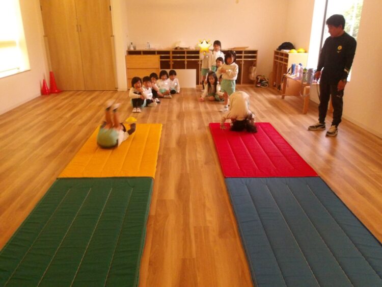 普段行くことが少ない2階の保育室で体操の先生に会い、少し緊張した様子で入室し、じっと静かにお話しを聞いていましたよ。