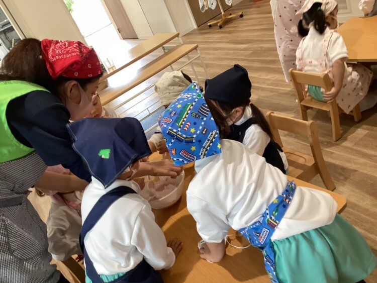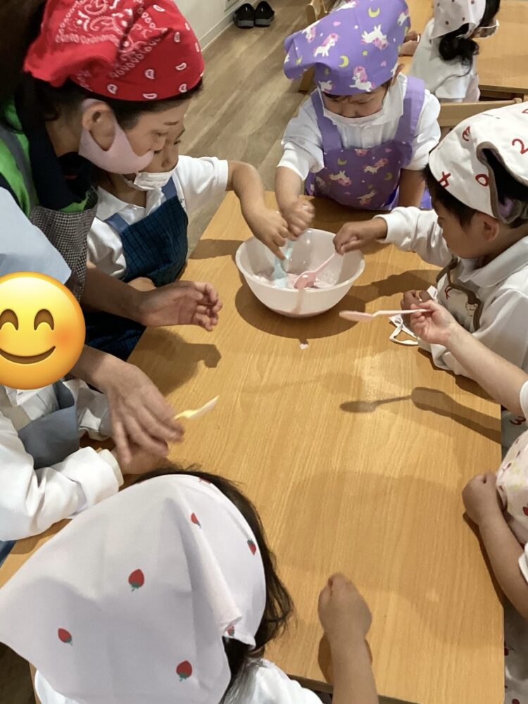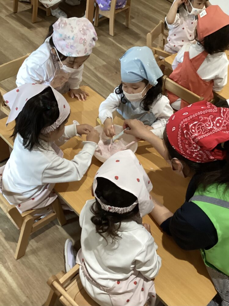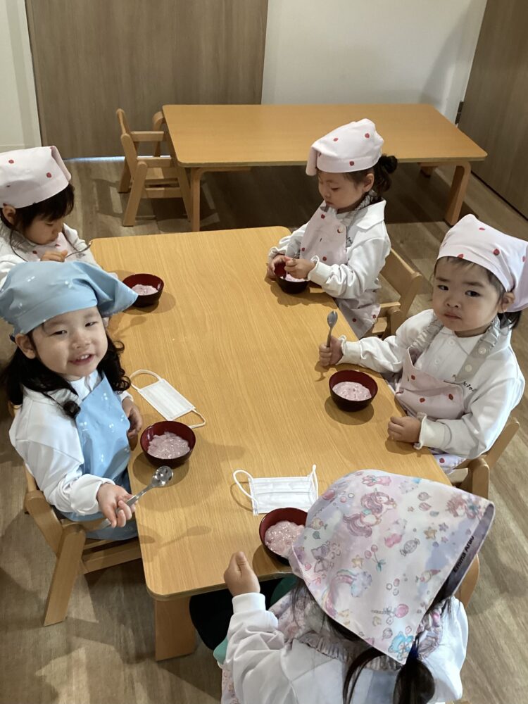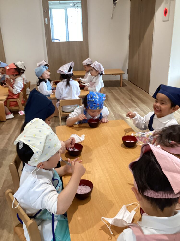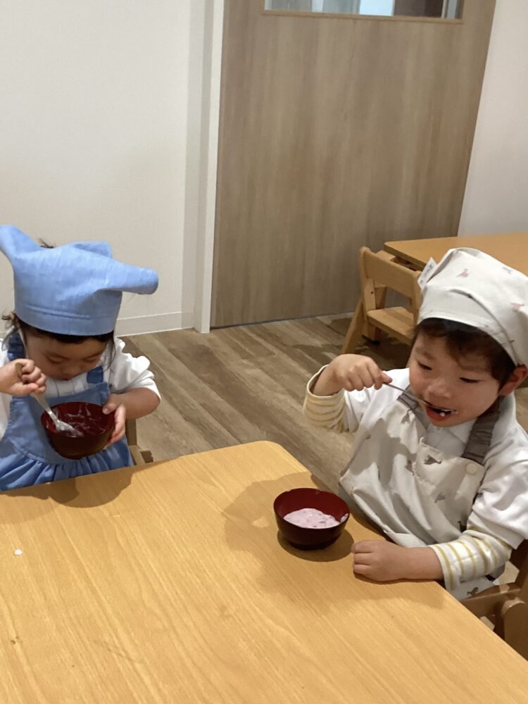 「美味しいね😋!」「あまあーい」などお友達や先生と感想を言い合って食べていました!「おかわりあるー?」と言っていうほど美味しかったみたいでした!これから色々な物を作るのが楽しみだね!先生もこれから一緒にするのが楽しみです![]()