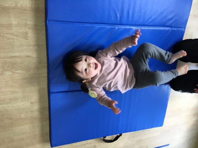 まずは、マットの感触を確かめられるよう、パンパンと叩いてみたり、横に寝そべったりしました😃
