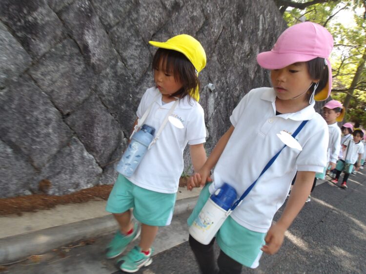 そら組さんはたいよう組さんのお兄さんお姉さんと、にじ組さんはお友達と手を繋いで歩きました🚶