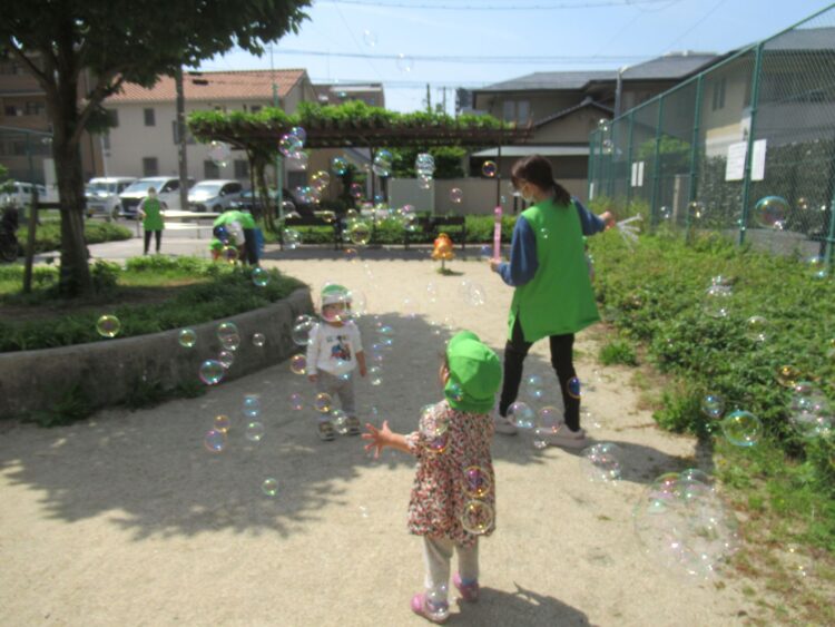 ふわふわと飛んでいくシャボン玉を追いかけたり、手を伸ばしてつかまえようとしたり、子どもたちは大はしゃぎでした。