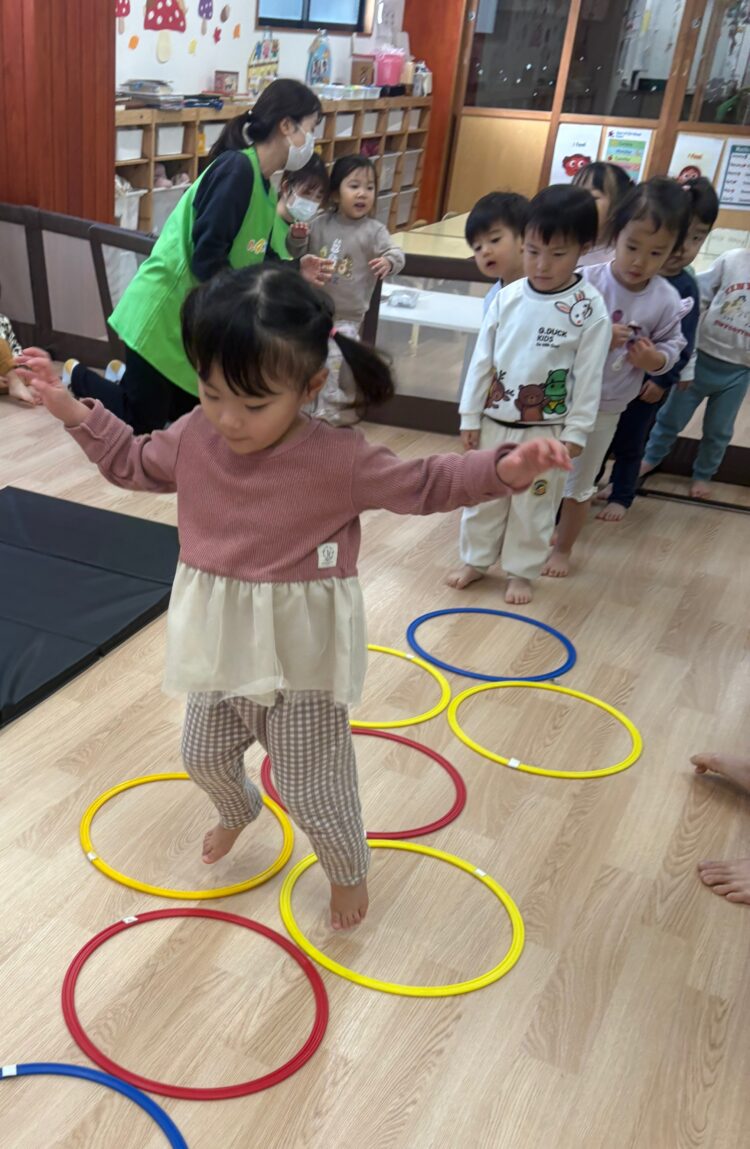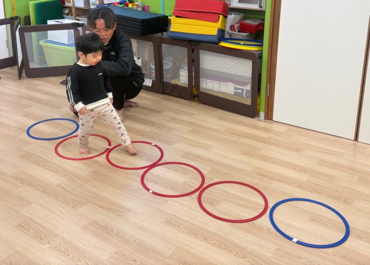 床に並んだカラフルなリングの上を、ゆっくり歩いたり「ぴょん!」とジャンプしたりしました。