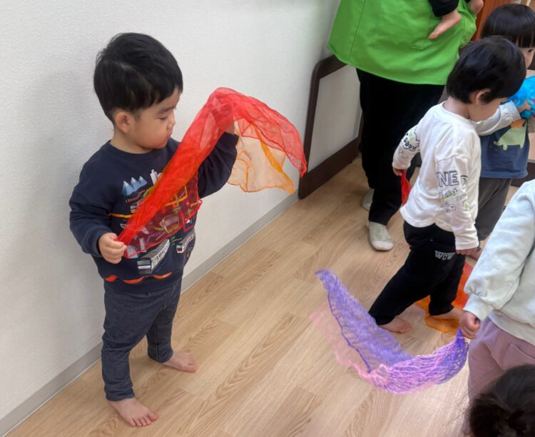 リトミックスカーフを使った活動では、凧揚げや獅子舞になりきって遊び、自然と笑顔があふれていました☺️