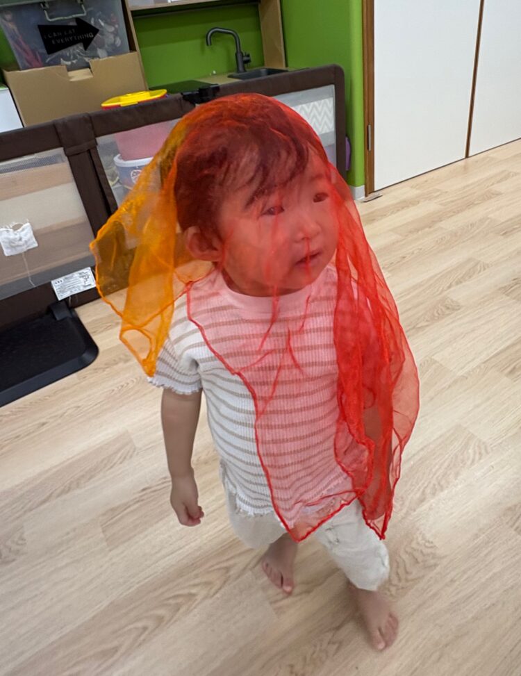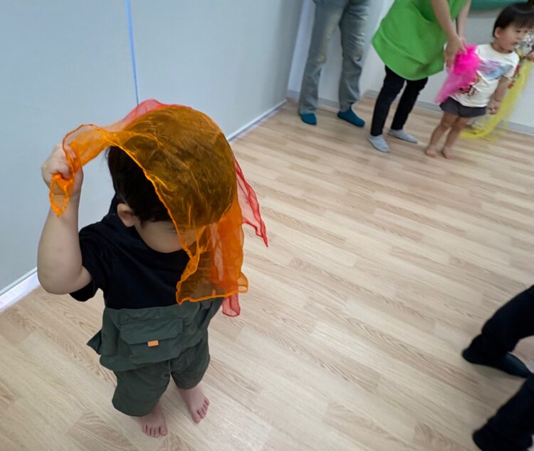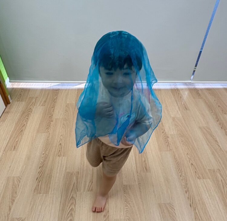 リトミックスカーフを使っておばけに変身しながら、音楽に合わせて体をたくさん動かしましたよ