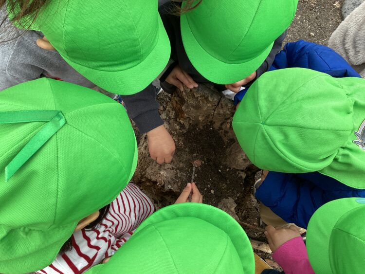 切り株には土が詰まっていて、中を枝でホジホジしていみると小さな幼虫を発見🔍