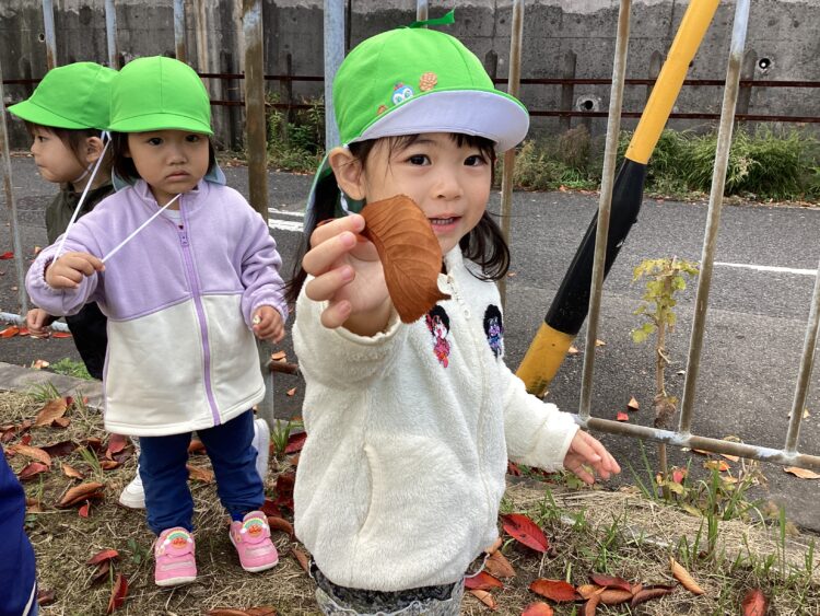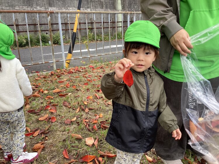 赤や黄色に色づいた葉っぱを見つけて「みてみて〜😊」「あかいのあった!」と嬉しそうに教えてくれました🙌