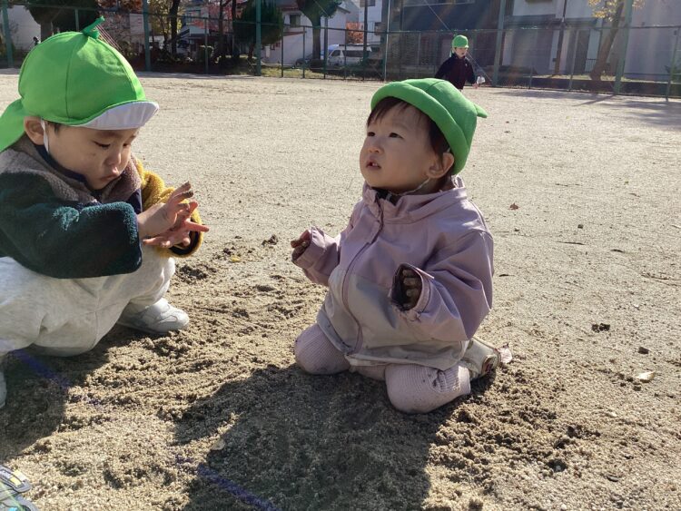 グラウンドの砂が湿っていて、いつもと違う感触に興味津々で掘ったり握ったりして楽しんでいました👀✨
