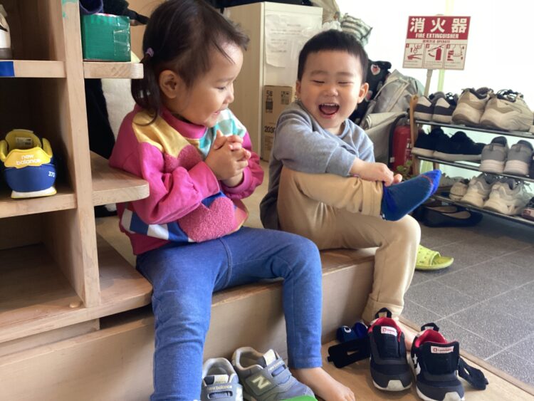戸外に行くお友だちは、自分たちで靴下や靴を履くのもおてのもの✨早く行きたい気持ちから、「〇〇ちゃんもうはけちゃったよ!」