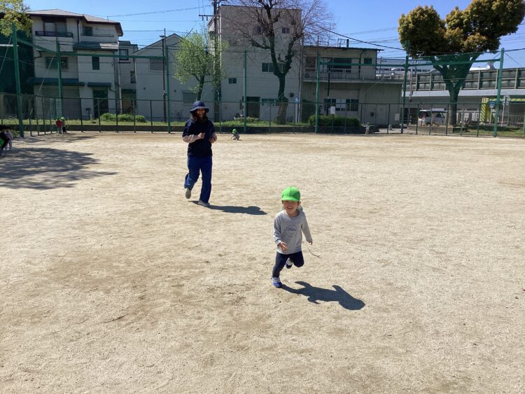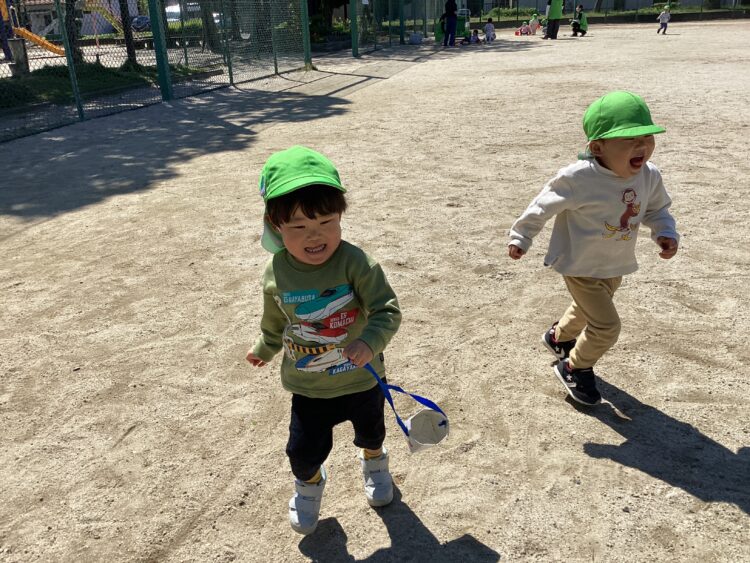 「まてまてー!」と保育者が追いかけると、ニコニコの笑顔で逃げていくお友だち!