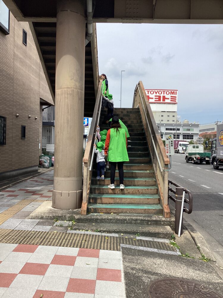 歩道橋の上から下にいるお友だちと先生に「おーい!」と手を振るお友だち🤭