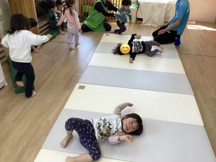 そしてマット運動では1人ずつご寝転がってコロコロ〜と転がります。順番を守ってやることができました✨