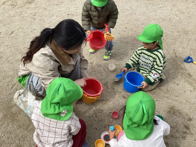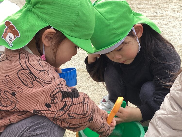 大好きな砂遊びでは、お友だちと協力しておいしいご飯をたーくさん作っていましたよ!