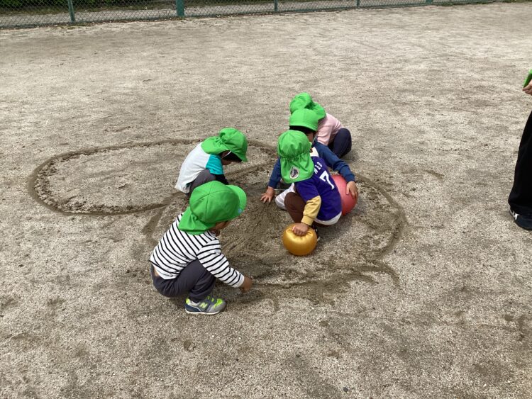 花びらを集めたり、水たまりに近づいてみたり、いつもと違う砂の感覚を手で触ったり、自然の中での遊びをそれぞれの興味に合わせて夢中になって遊ぶ姿が見られました。