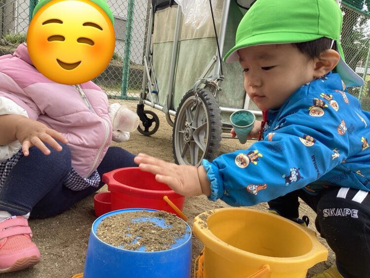 スコップやバケツを使って砂をすくったり、触れたりして砂遊びを楽しんでいました♫