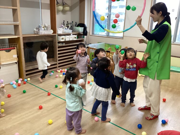 なかなかボールがつかず、苦戦する姿もありましたが、自分なり考えてつけようとするお友だち😊