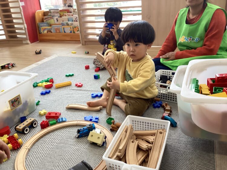 こちらでは線路をつなげて電車を走らせたり、ブロックで家を作ったりして楽しんでいました😊