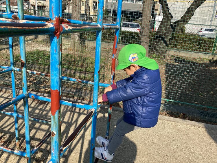 鉄棒を見つけたお友だちは「こんなことできるよ〜😊