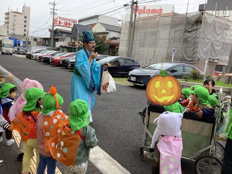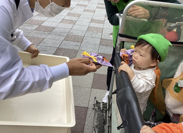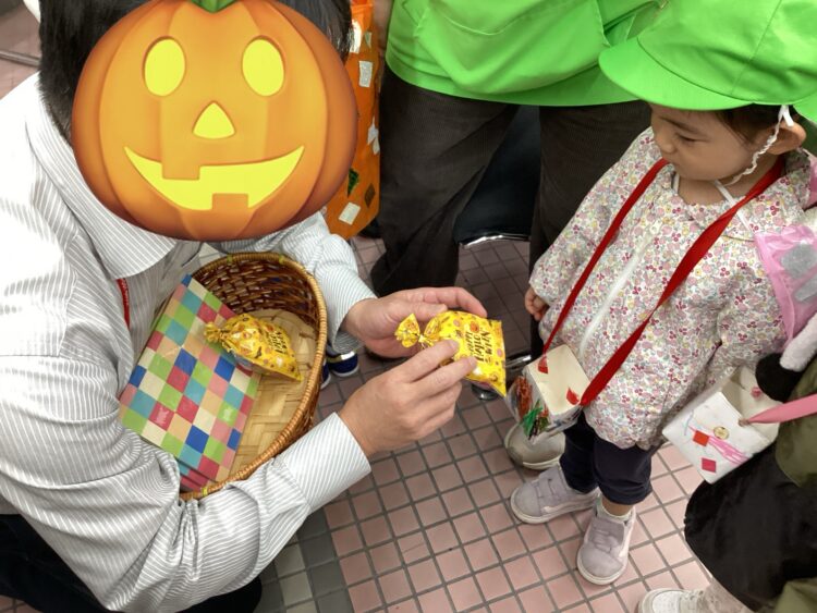 午前中はお外に出て、みんなでお菓子をもらいに行きました!