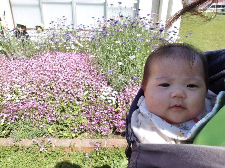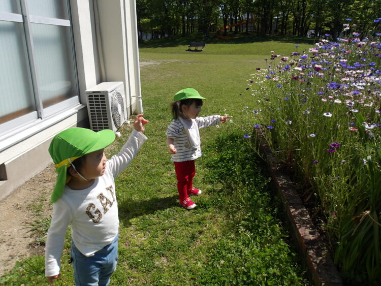 花壇のお花をみんなで見ました!保育士が色を英語で伝えると、真似をして「ピンク!」「ブルー!」と言っている子もいましたよ![]()