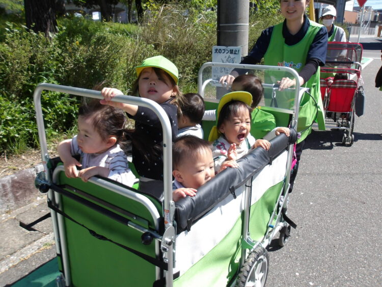 カートに乗り出発するときに保育士と掛け声を合わせて「レッツゴー
