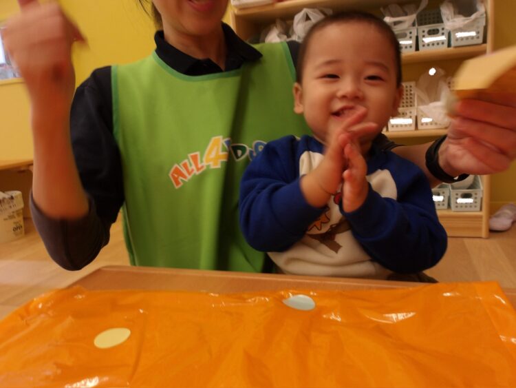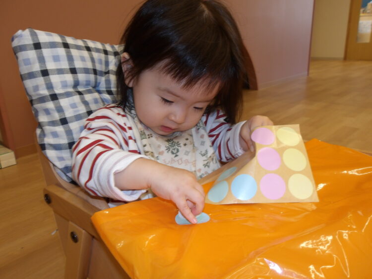 初めてシール貼りに挑戦したひよこ組さんです
